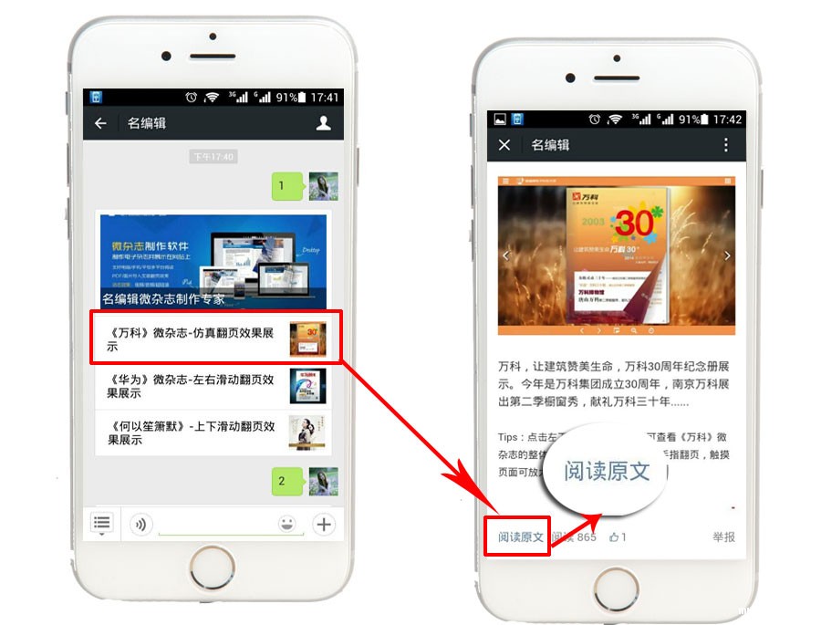 每一期的微杂志为一个图文消息,添加微杂志的URL为原文链接,读者用iPhone,Android,iPad登陆微信,点击微杂志介绍页面左下角的“阅读原文”,就可以直观查看微杂志。
